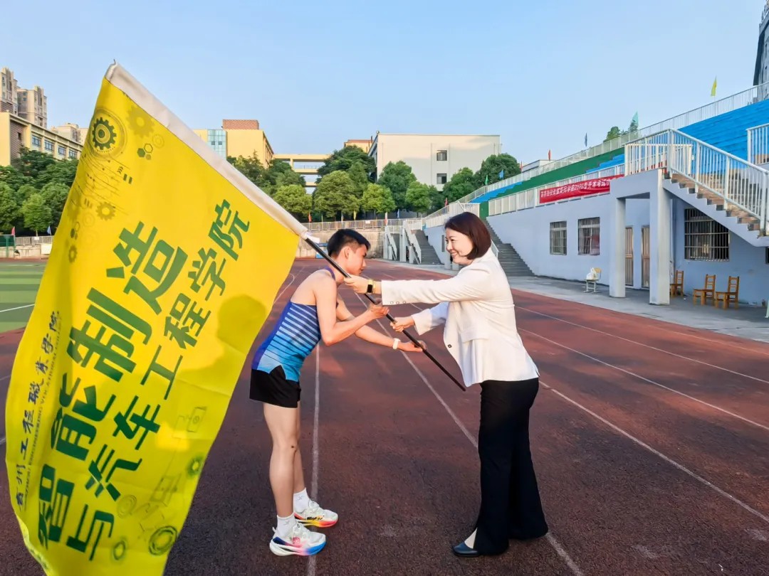 仪式尾声,由智能制造与汽车工程学院党员教师组成的“先锋领跑团”佩戴党徽,高举院旗,带领师生绕场完成首场3公里健康跑。