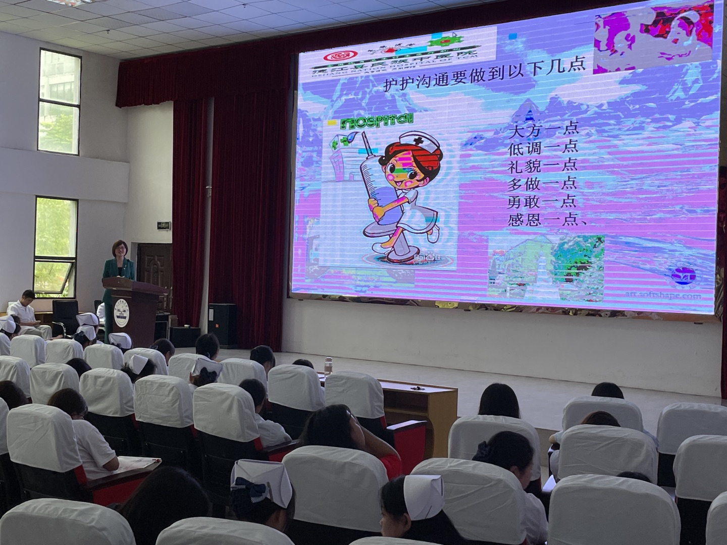 接下来,刘兰主任进行了《如何做一名合格的护士和优质护理服务中的人际沟通》专题讲座。首先,她从丰富的护理实践和护理管理经验,结合新时代新医学模式的要求,提出护理工作性质对一名合格的护士的职业道德和素质要求,包括热爱护理工作和奉献精神、认真负责和一丝不苟、语言谨慎和行为谨慎、勤观察多沟通、团结协作和密切配合、加强学习和提高文化素质、提高身体素质和礼仪知识,以及做好健康教育宣传等,总结出要做一名合格的护士,现在在学校就要进行八个方面的修炼,为护理专业学生的成长指明了努力的方向。