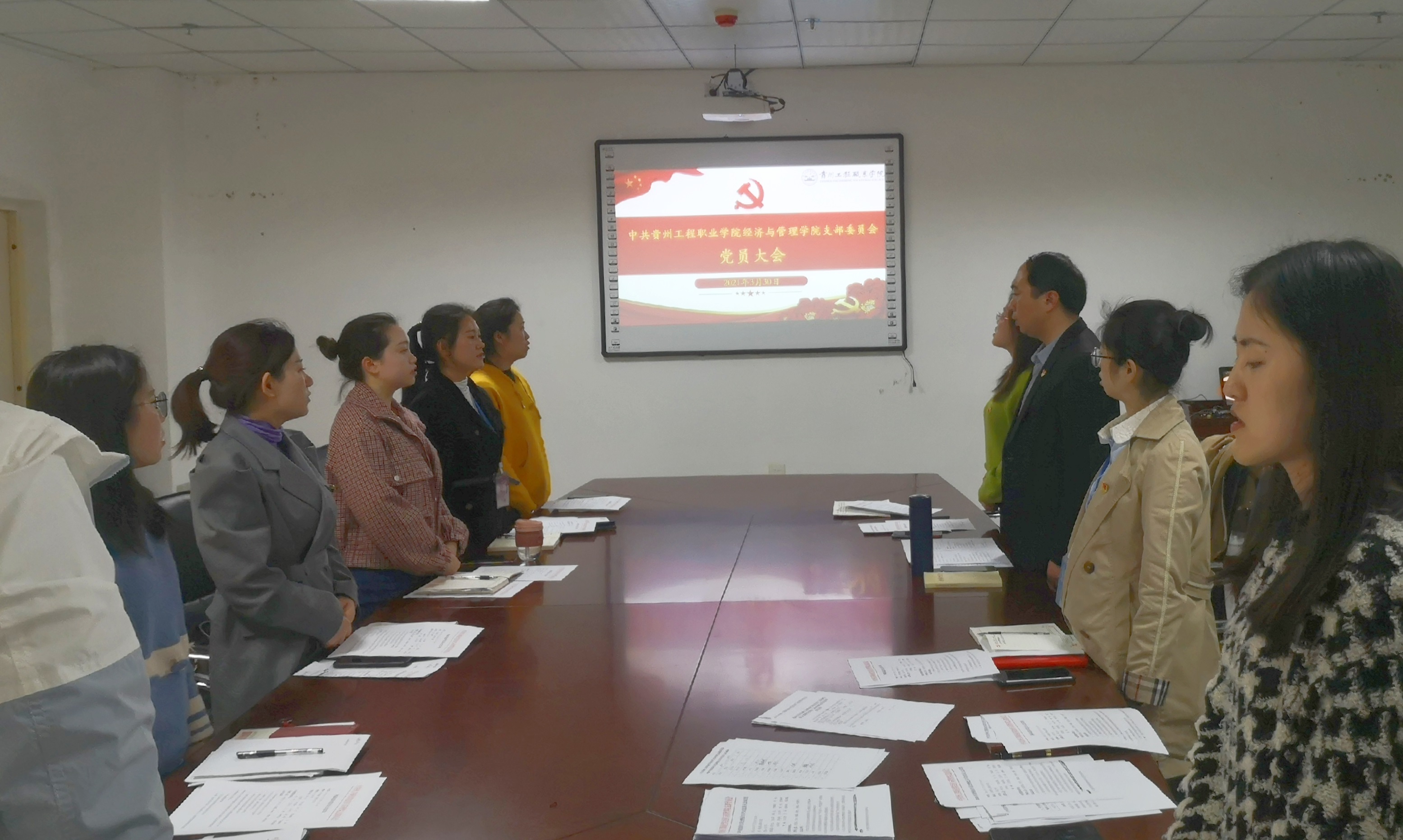 大会在庄严的国歌奏响下开始,包万洪同志通报了到会党员人数,到会人数符合党章和基层党组织换届选举的相应规定,换届选举大会正式开始。首先,包万洪同志代表上届党支部委员会作了工作报告,全面总结了三年来党支部自身建设、推动学院发展中取得的成绩和不足,全体党员对支委会的工作给予了充分肯定。