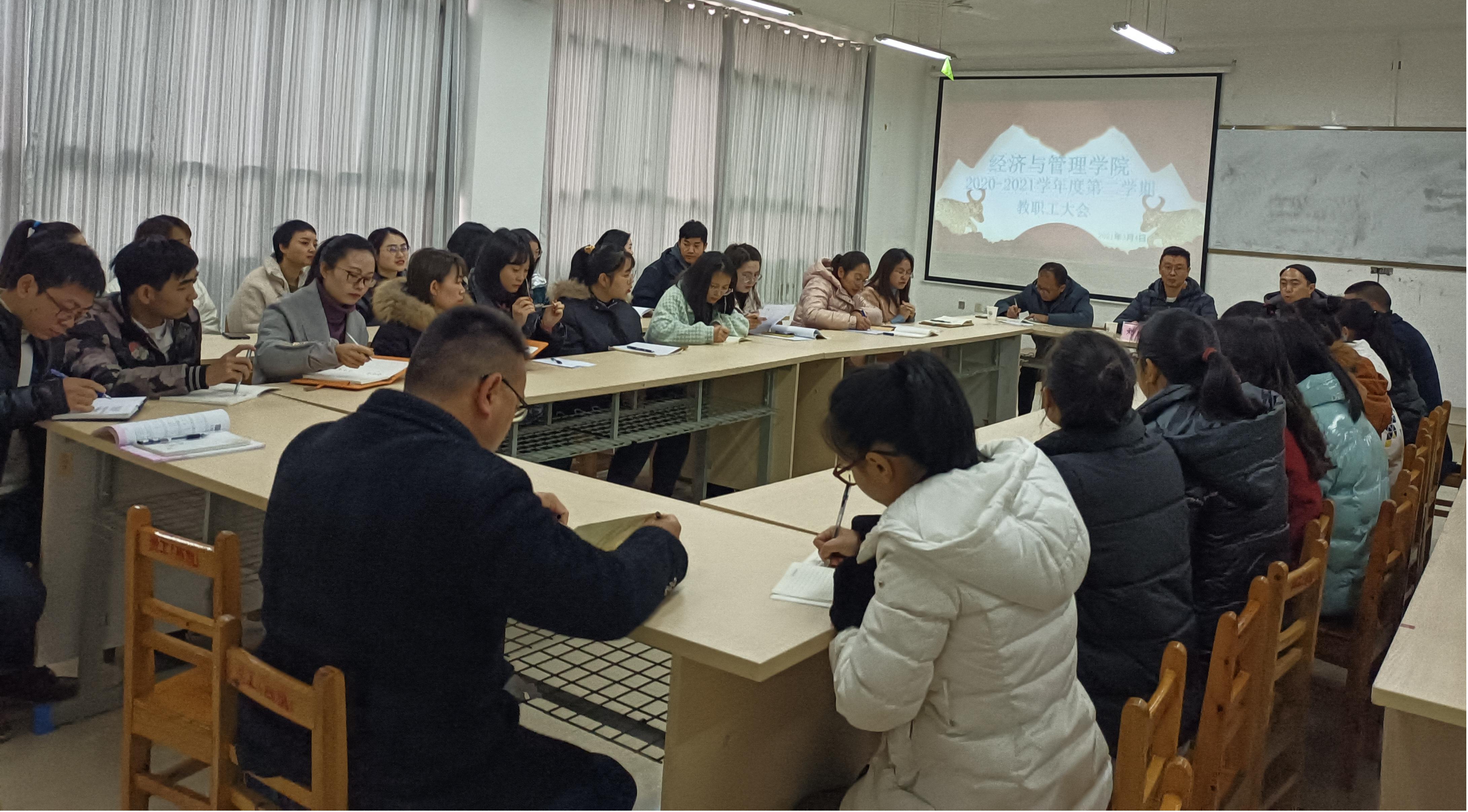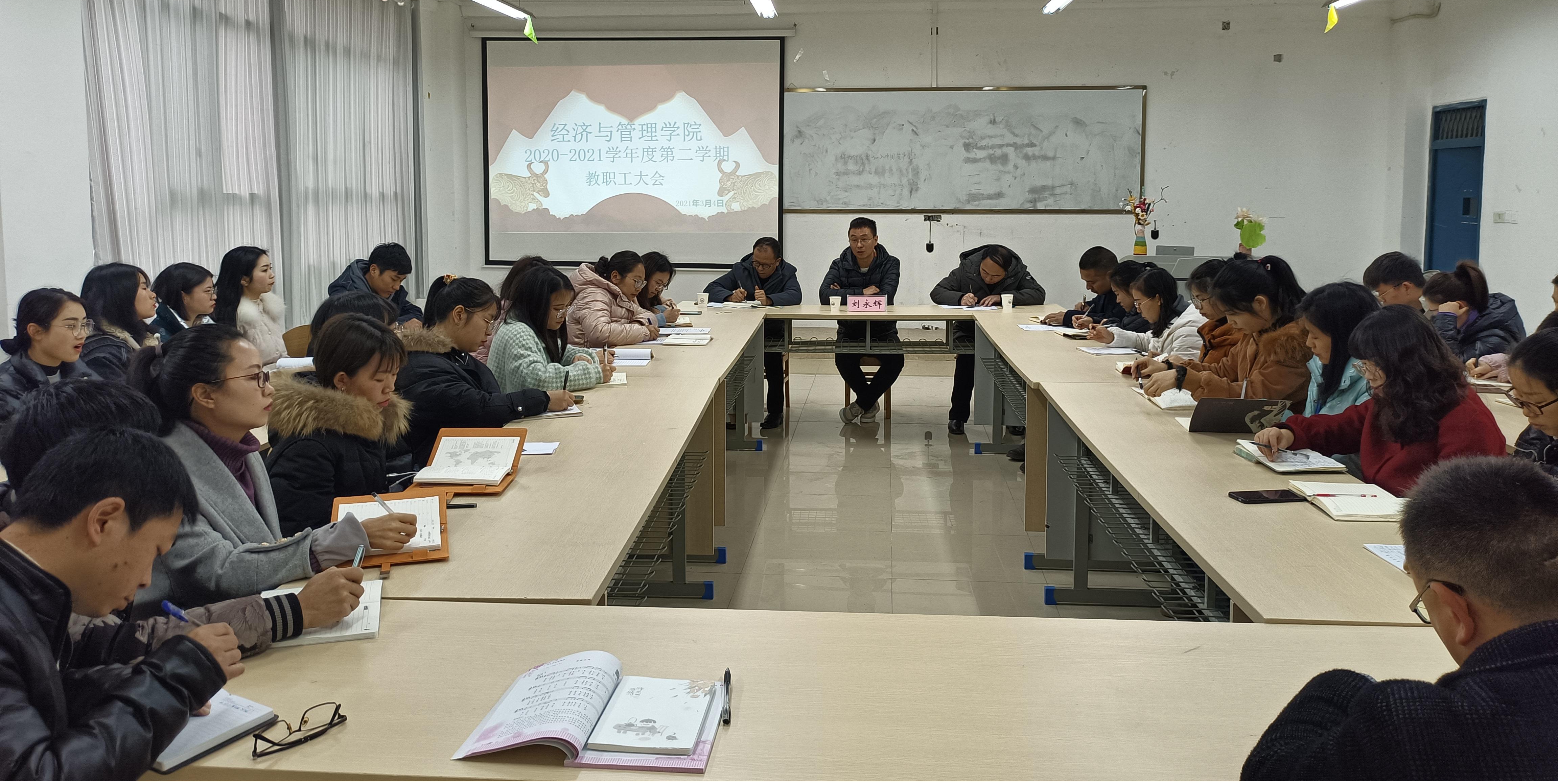 3月4日,经济与管理学院在教学楼C栋403会议室召开2021年度第一次教职工大会,对新学期各项工作进行动员部署。副校长刘永辉出席会议并讲话,院长郭俊东,,全院教职工参加会议。会议由党支部书记包万洪主持。