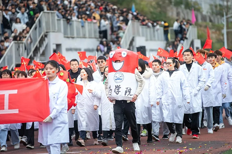 在开幕式上,首先国旗、校旗、团旗、校训、彩旗方阵、志愿者方阵入场。接着各部门、二级学院各具特色的运动员方阵依次入场。其中,由老师和学生组成的药学院运动员方队第五个出场,伴着激昂的音乐、踏着整齐的步伐、穿着整齐的白大褂、拿着五星红旗,神采飞扬、昂首阔步的从主席台走过,不顾寒风的凌冽,在环形跑道上留下青春的脚印。当各个方阵全部入场后,全体起立,升国旗,奏唱《国歌》,党委书记陈健宣布运动会开幕,原本寂静的田径场一下子变得热闹起来,精彩的啦啦操舞蹈表演拉开了活动序幕。
