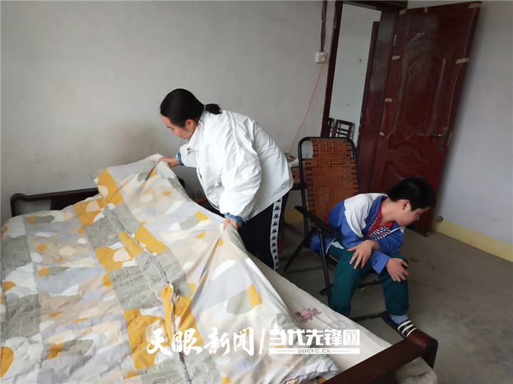 为贫困残疾人家庭整理床铺衣物(左一)